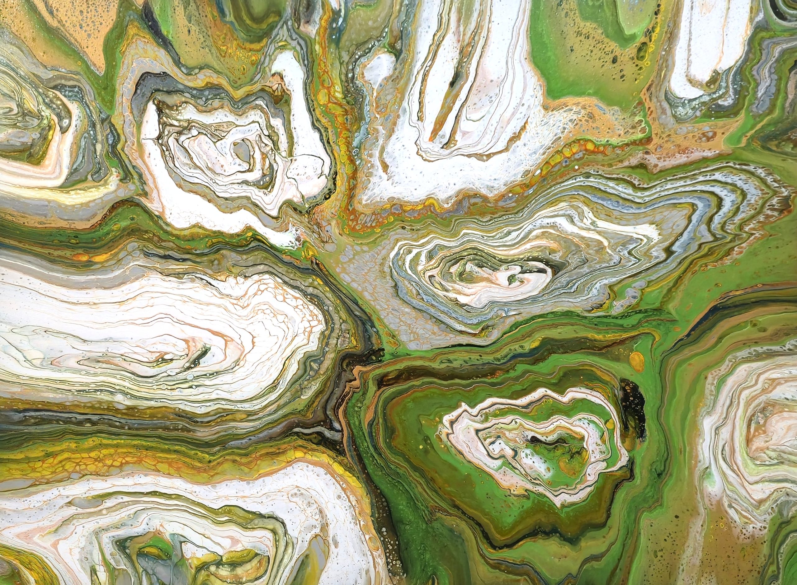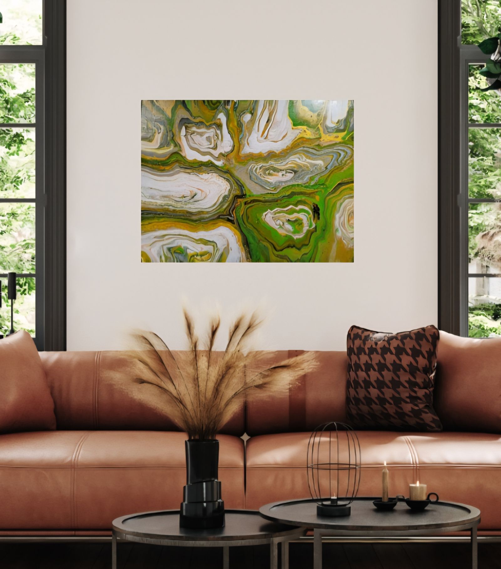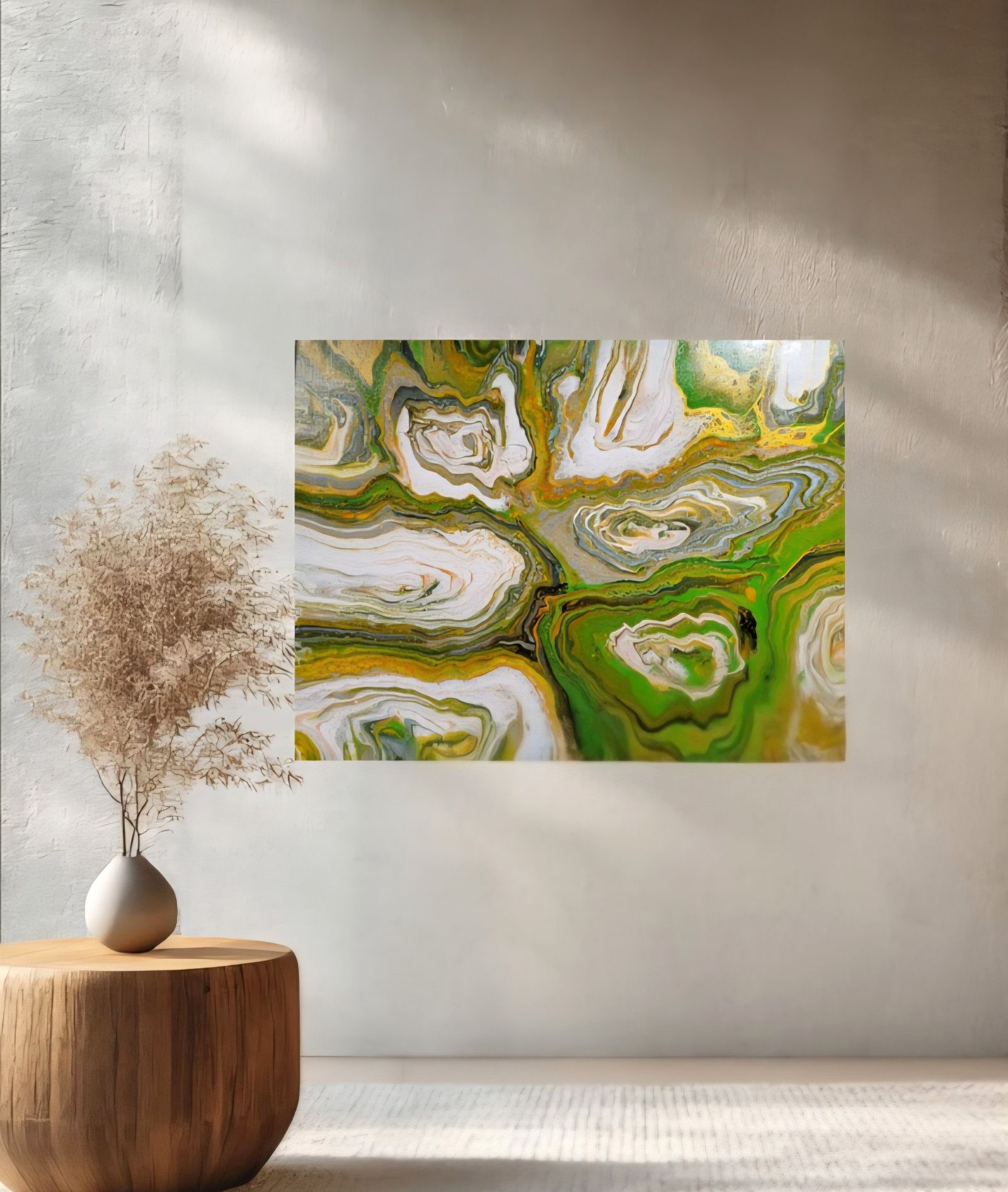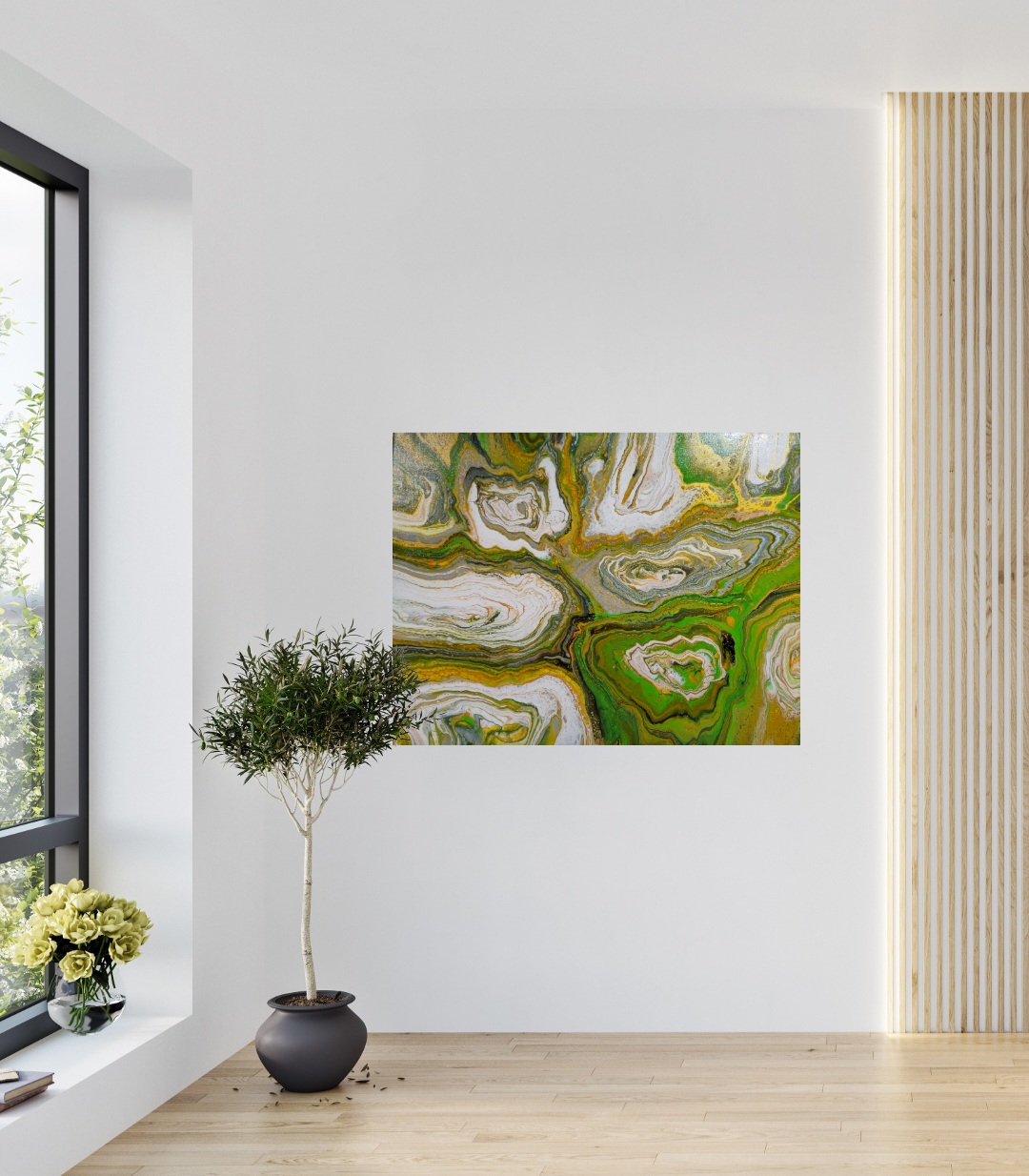 Due to the fluid dynamics of the acrylic pouring process, every piece is entirely unique. It is the only one of its kind in the world, as no two works are—or ever can be—identical.